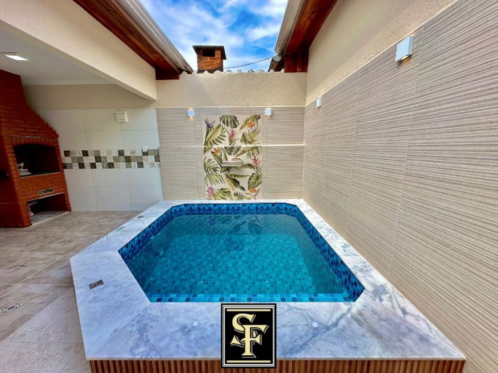 Casa geminada, possui 2 dormitórios sendo 1 suíte, sala, cozinha, banheiro social, área de serviço, área de churrasqueira, piscina, wc externo e 2 vagas de garagem. Imóvel em excelente estado de conservação e localizado a 200 metros da praia. Proprietário aceita financiamento bancário e estuda proposta a vista.